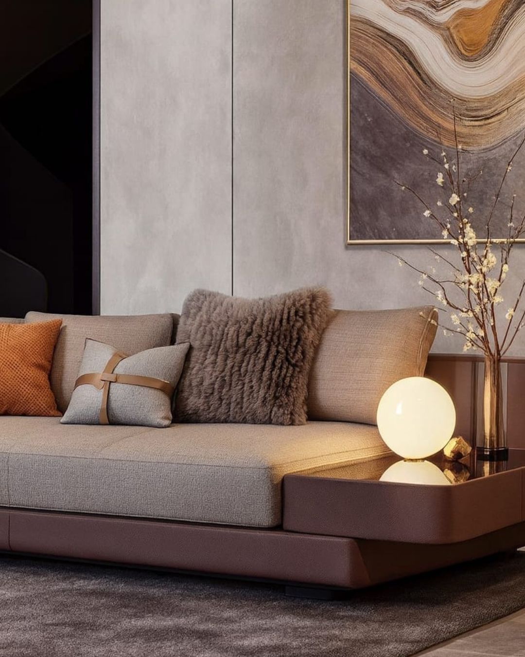 SOFA TAPIZADO EN TELA Y PIEL COLOR VINO, ENCIMERA LATERAL Y MESA DE SLLONES EN CRISTAL NEGRO