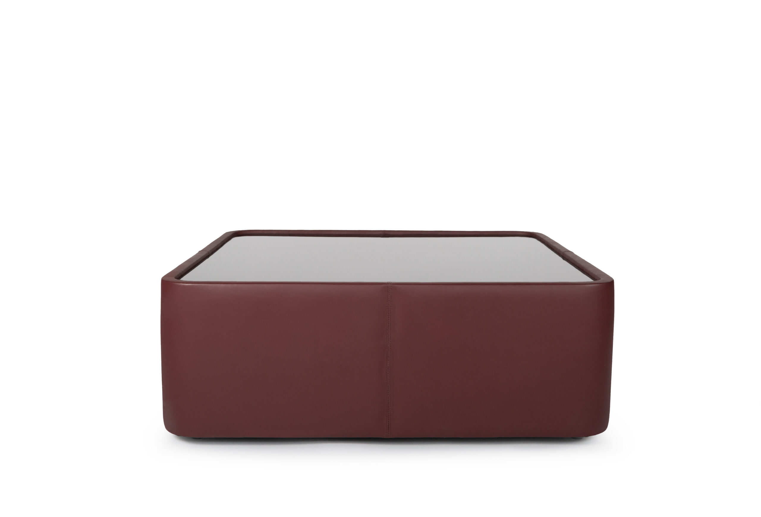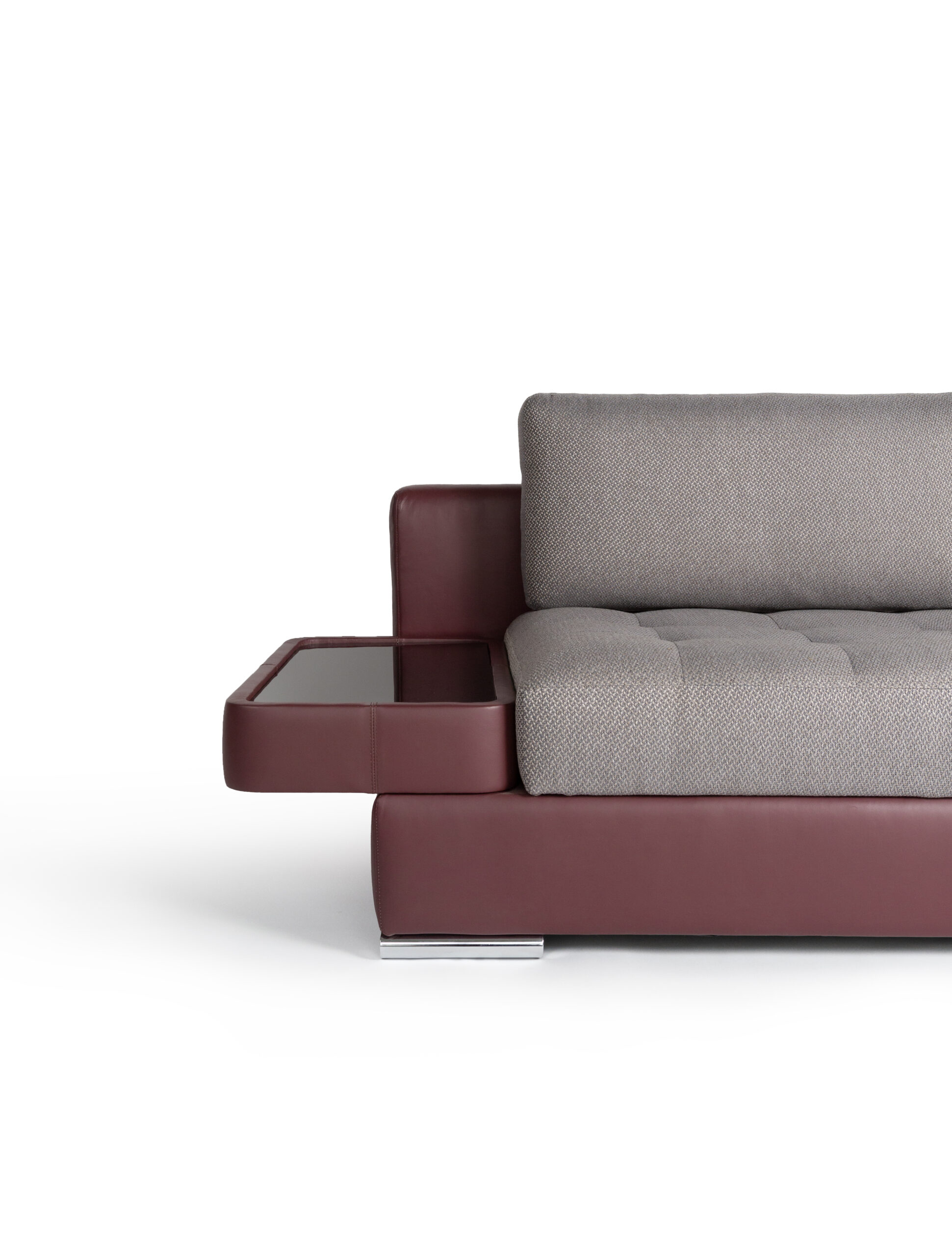 CUENTA CON 2 MODULOS MATERIALES: TAPIZADO EN TELA Y PIEL COLOR VINO, ENCIMERA LATERAL Y MESA DE SLLONES EN CRISTAL NEGRO